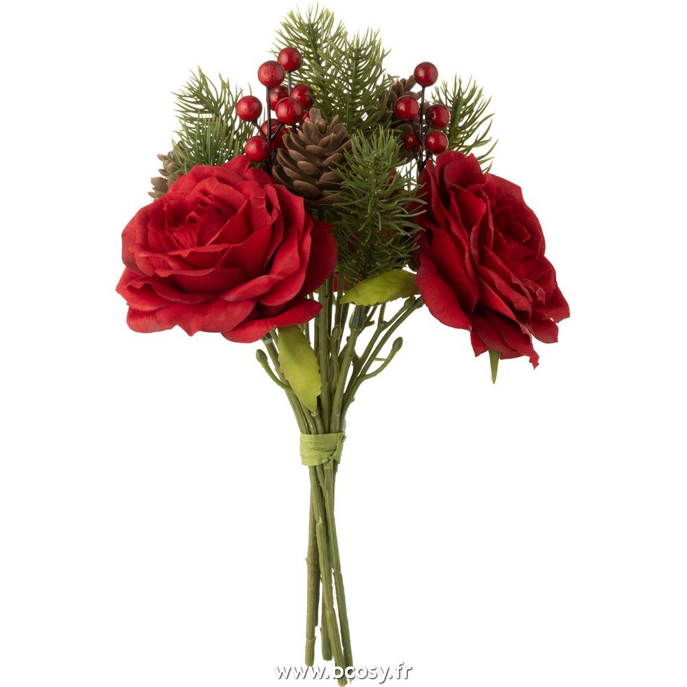 J-Line by Jolipa Bouquet Roses/Baies/Branche De Pin Plastique Rouge/Vert Small