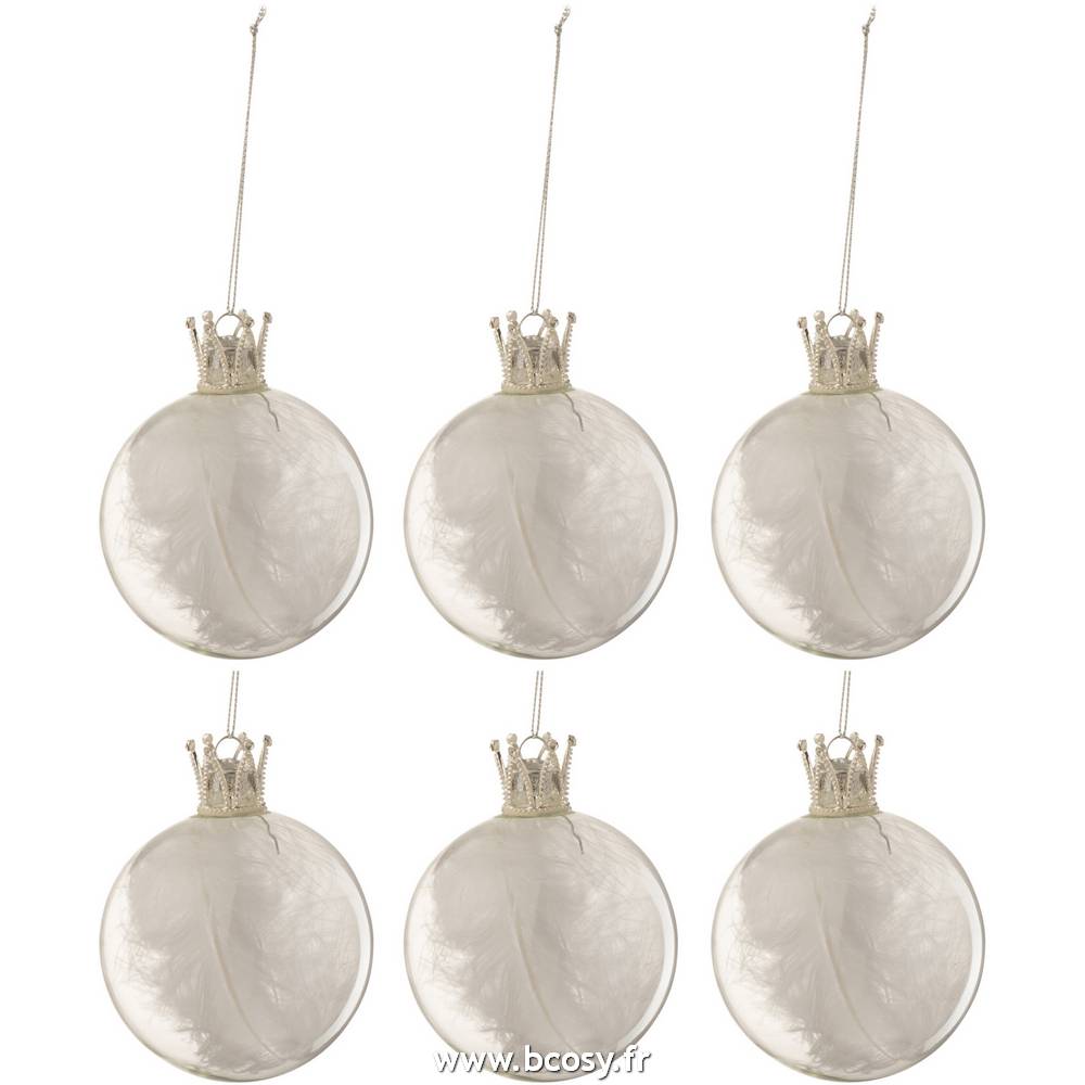 J-Line Boite De 6 Boule De Noel Couronne Plumes Blanc Verre Transparent Small L8xB8xH8 cm 17381