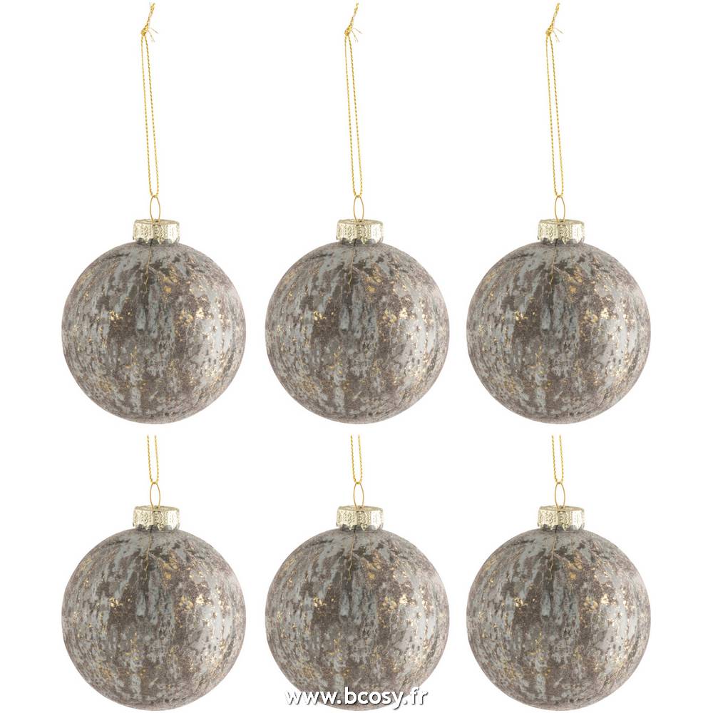 J-Line Boite De 6 Boules De Noel Velours Verre Antique Gris-Or Small L8xB8xH8 cm 17432