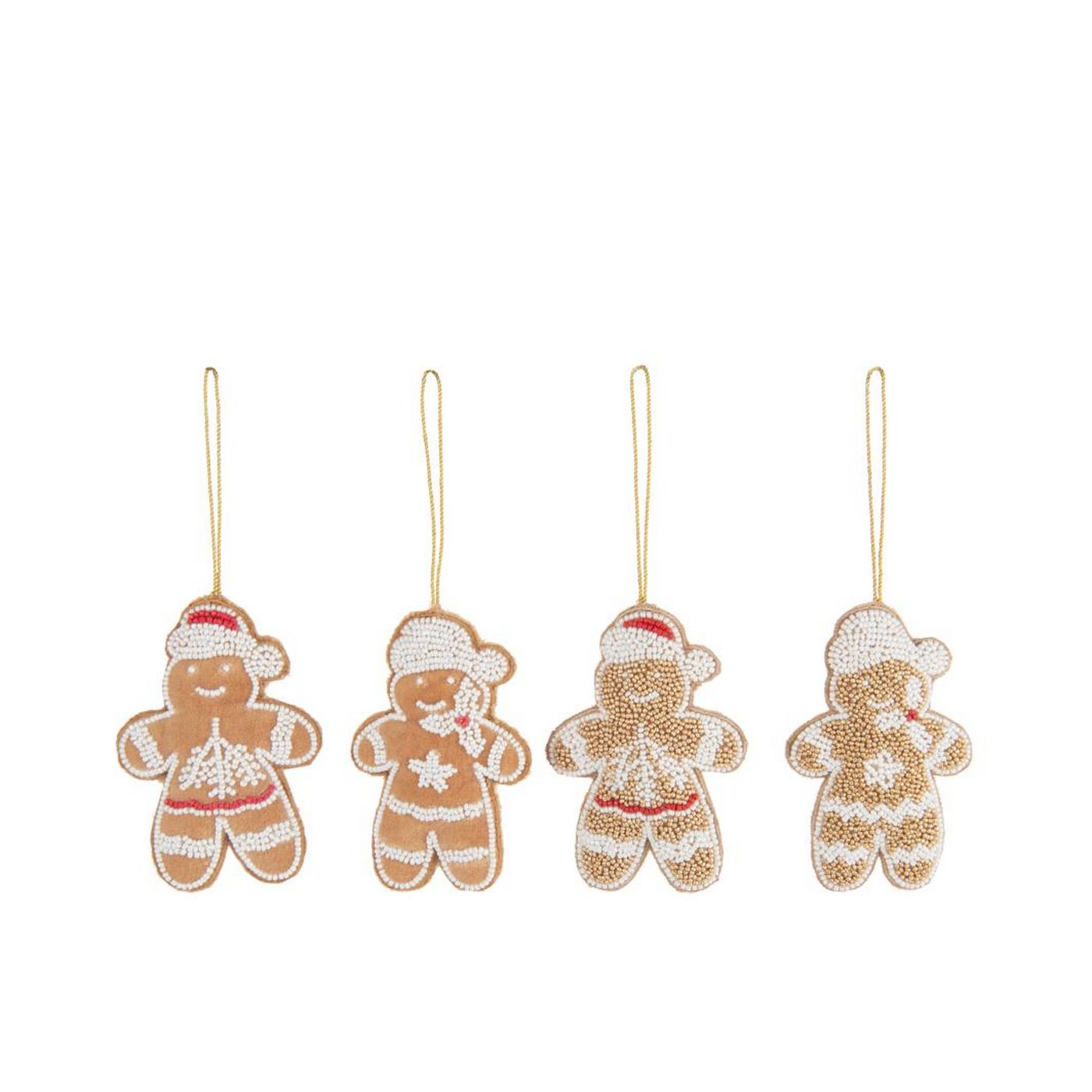 J-Line Suspension Bonhomme En Pain D'Épice Velours-Perles Caramel-Blanc L9xB2xH11 cm 56379 Assortiment de 4 pcs