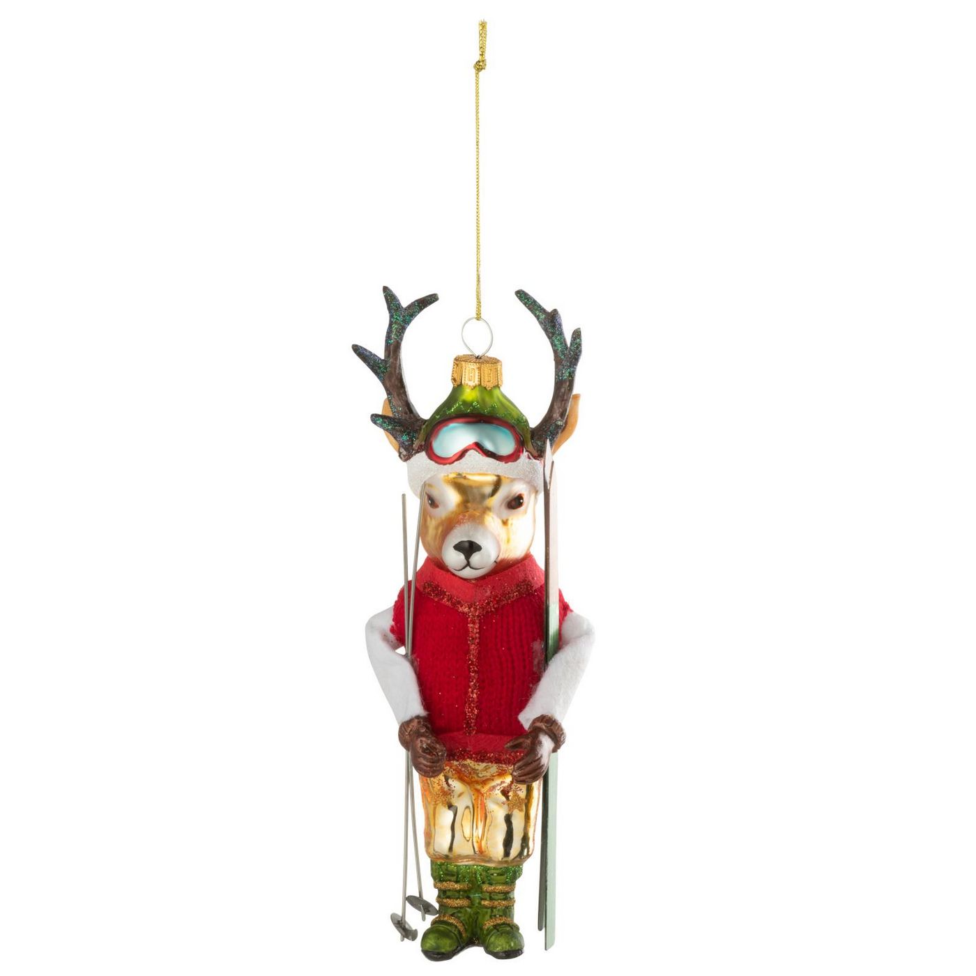 J-Line Suspension Renne Avec Skis Verre Marron-Rouge Noël L6xB6xH19 cm 59344