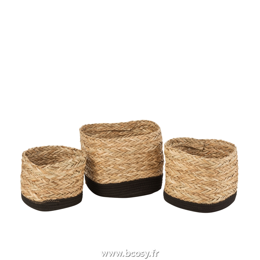 J-Line by Jolipa Set De 3 Paniers Carrés Herbe/Coton Naturel/Noir