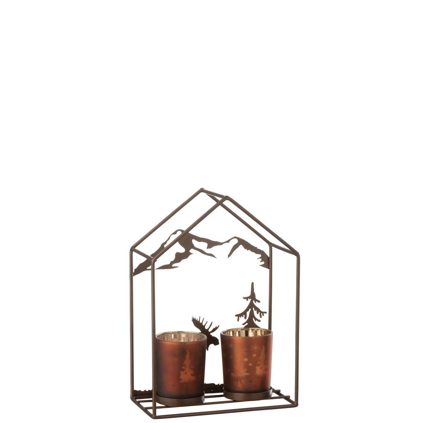 J-Line Photophore Maison 2 Verres Fer Rouille-Marron L16xB9xH22 cm 58382